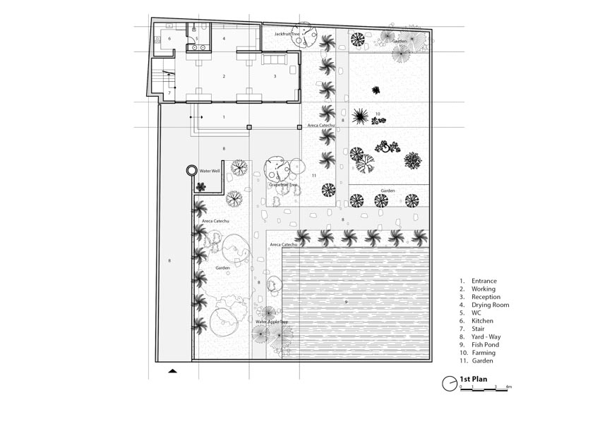 Tầng hai là không gian sinh hoạt của người sáng lập thương hiệu COMAY – cũng là “chủ xưởng” của những sản phẩm thủ công mang hơi thở đương đại. Ở đây, các khu vực tiếp khách, ăn uống và nghỉ ngơi được bố trí như một “phòng khách lớn” – nơi mà tầm nhìn không bị ngăn cản, thiên nhiên bốn mùa len lỏi vào từng bức tường. Một khoảng trống hình tròn ở giữa là điểm nhấn đặc biệt: dẫn ánh sáng, dẫn gió và dẫn cả những cuộc trò chuyện xuyên tầng.