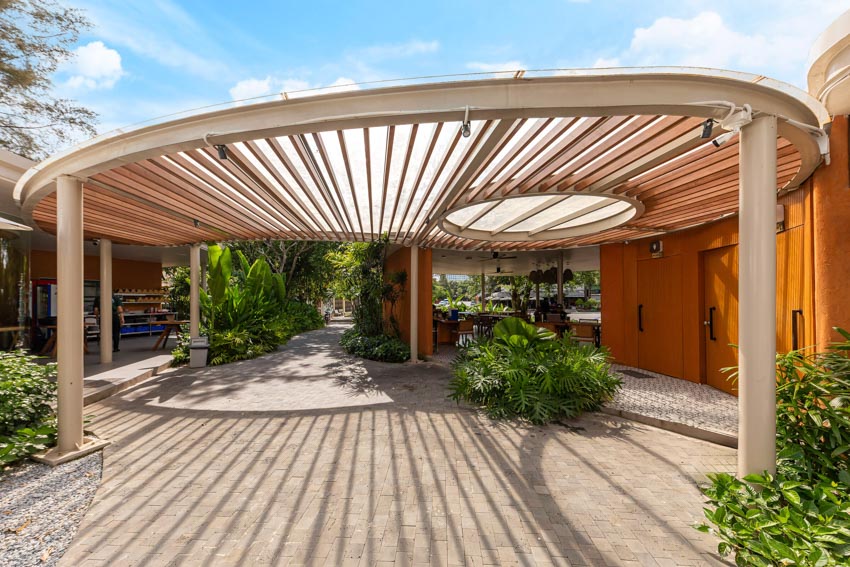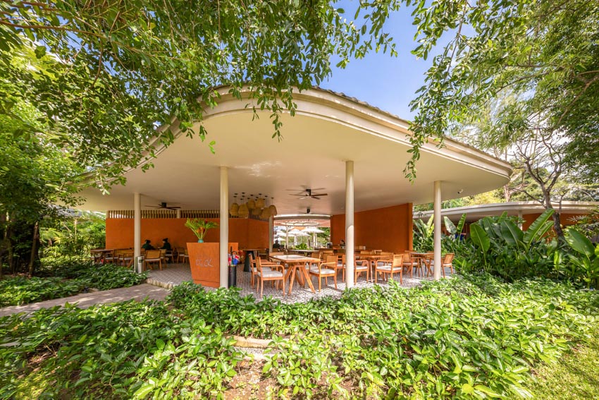 Từ bên ngoài, KAYA như một dải gỗ mộc vươn dài theo triền sông. Những ô cửa vòm cong đón nắng, nền đá mát lạnh và mái lá xám phai dần theo gió — tất cả đều mang vẻ bình yên của một ngôi nhà đã ở đó từ lâu, chờ đợi con người tìm lại mình.
