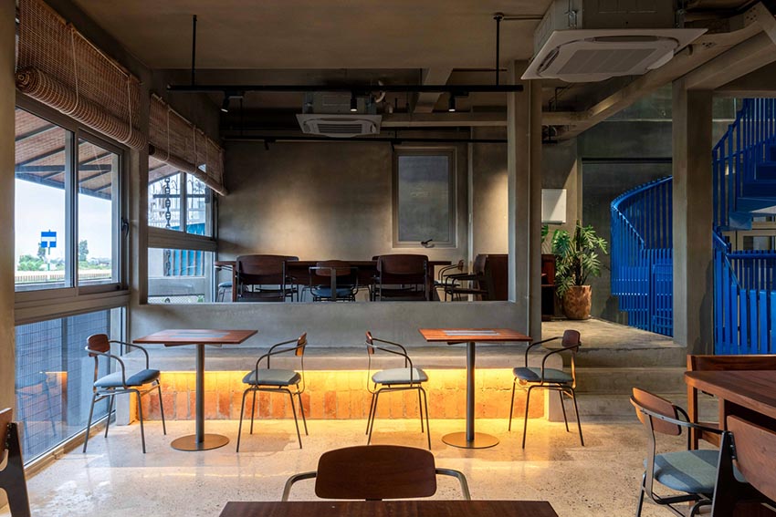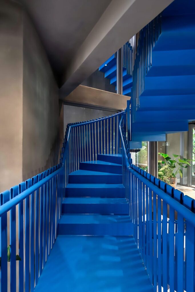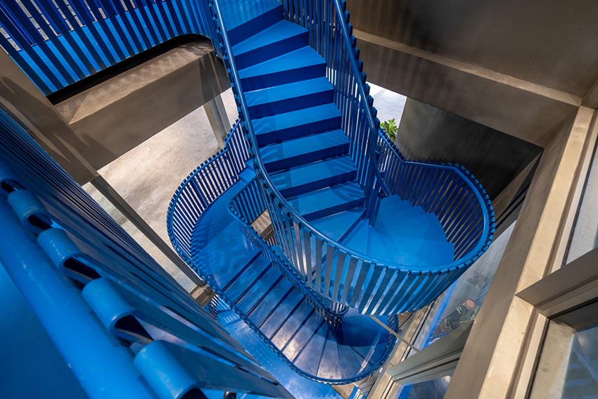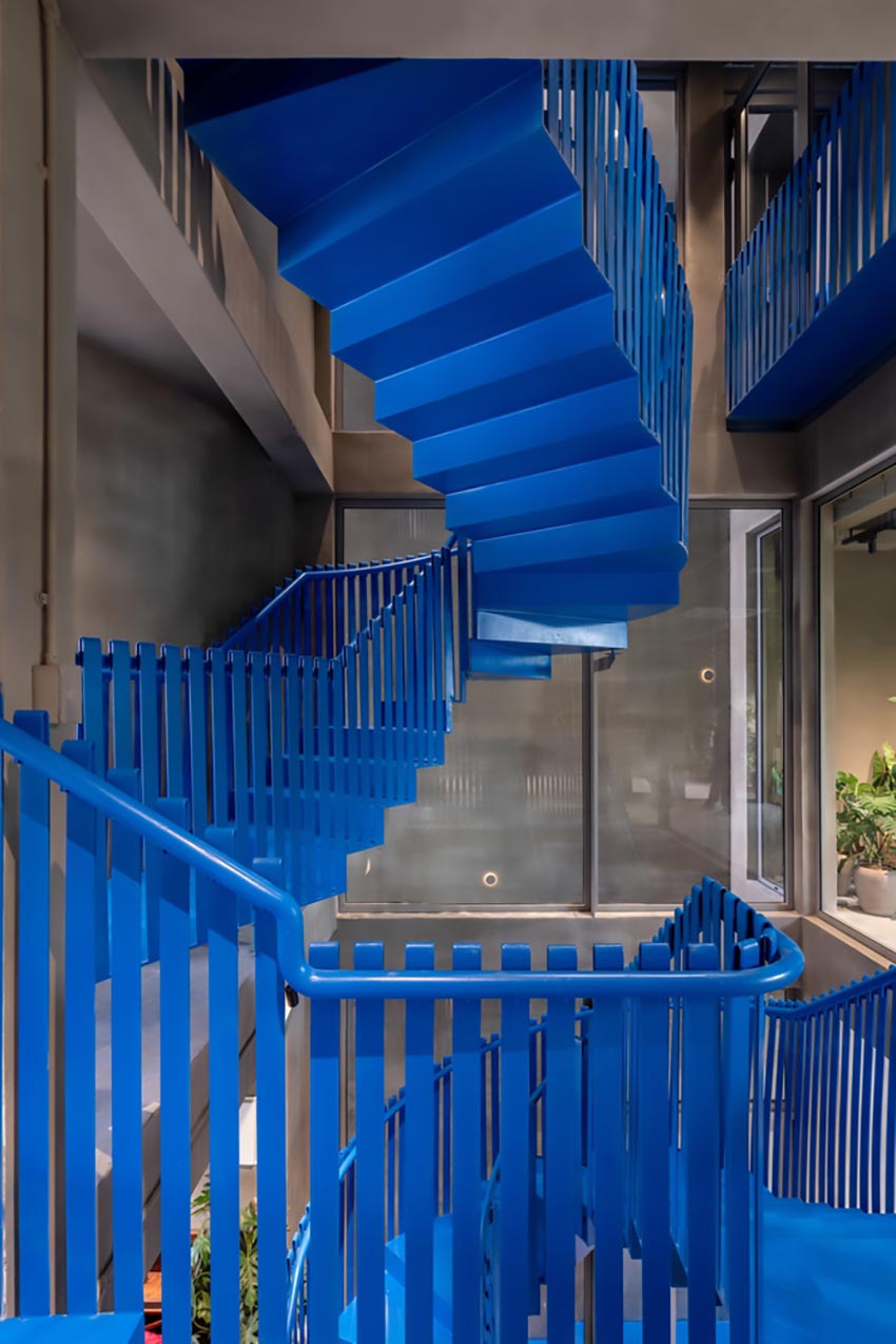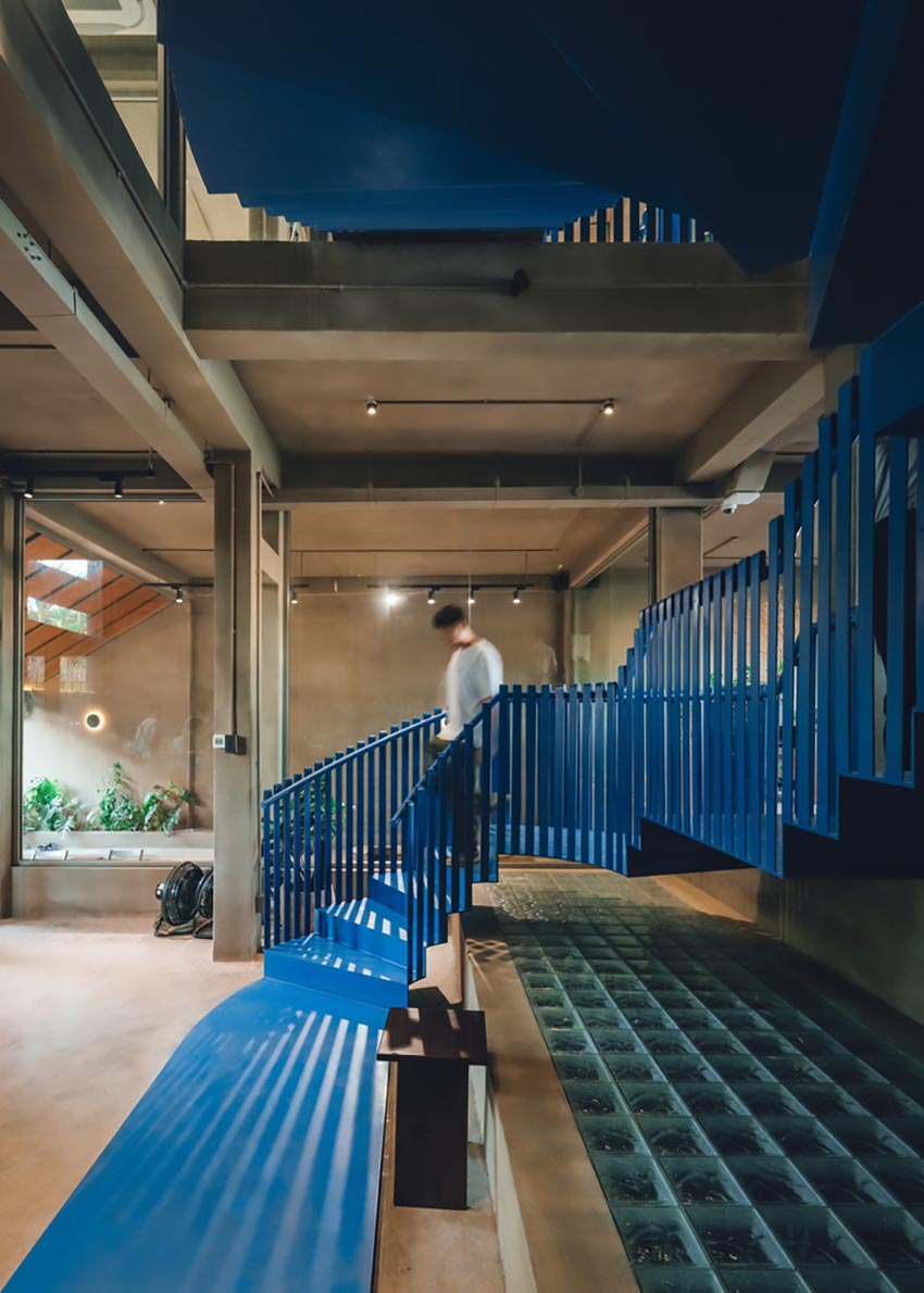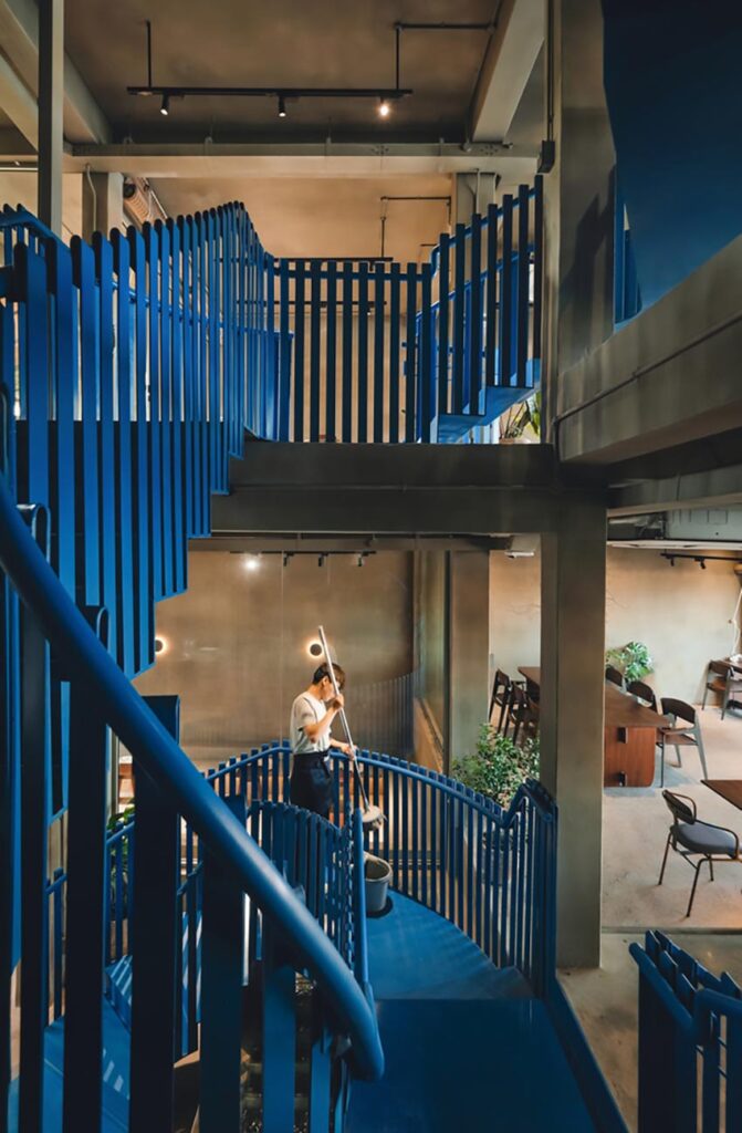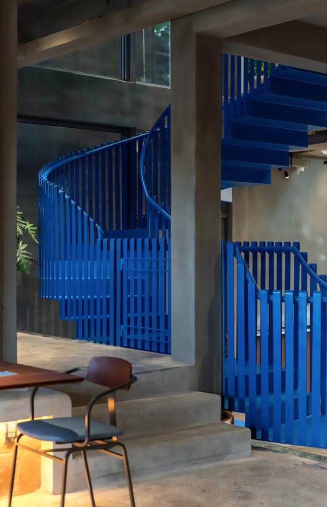 Điểm nhấn thị giác chính là cầu thang xoắn màu xanh lam rực rỡ, đóng vai trò như trục điêu khắc trung tâm, dẫn dắt chuyển động theo từng lớp chức năng: từ quán cà phê đến không gian triển lãm và khu làm việc chung. Thiết kế linh hoạt này cho phép các hoạt động thường nhật diễn ra đan xen, liên tục, trong một hệ sinh thái không gian được mở rộng tối đa. Chức năng không gian không bị cố định trong giới hạn khung tường, mà được hòa quyện nhờ vào cách tổ chức mặt bằng và dòng chuyển động tinh tế. Cách tổ chức mặt bằng phi tuyến tính này khơi gợi cảm giác tự do, phi cấu trúc, rất gần với tinh thần “open architecture” – kiến trúc mở, nơi người dùng là những nhà thiết kế đồng sáng tạo không gian. Tính linh hoạt là một trong những chiếc chìa khóa giúp Dom-Ino thích nghi với đời sống cộng đồng đương đại.