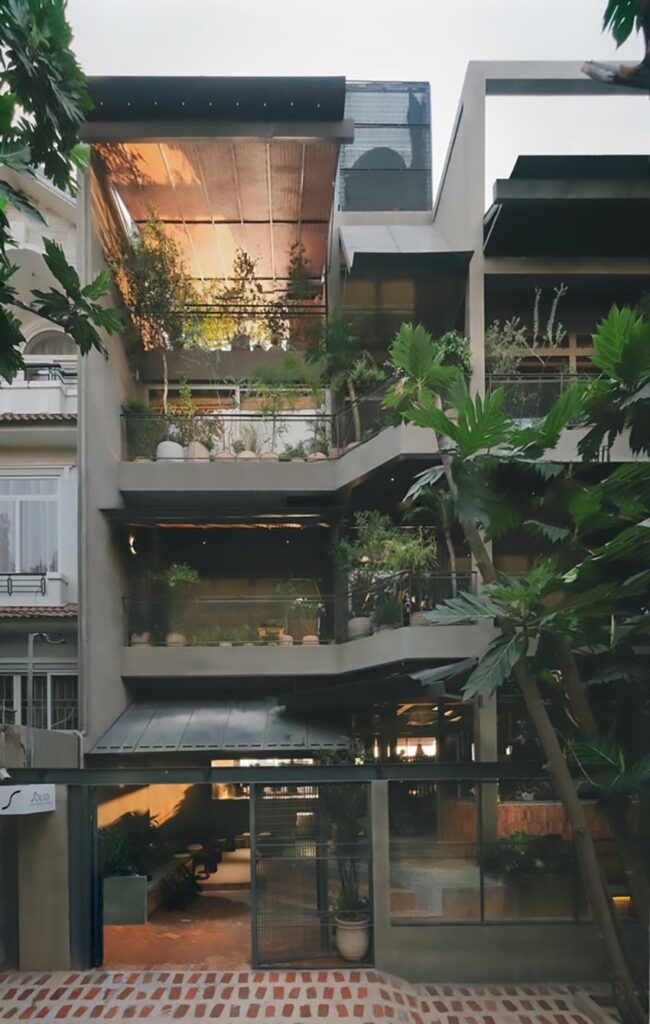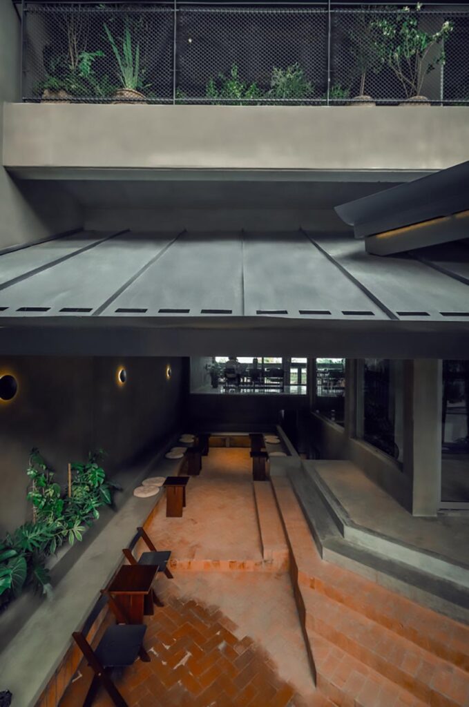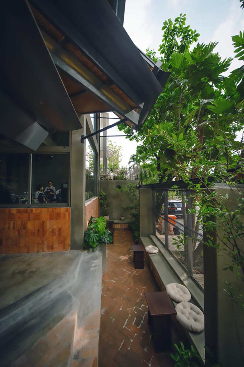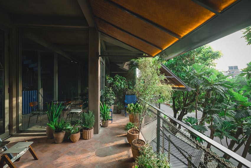 Không gian được xử lý như một chuỗi lớp lọc: từ ngoài vào trong, từ cứng đến mềm. Lớp rào thô được tháo bỏ, thay bằng các lớp hiên, rèm, vật liệu đan tay, cây xanh và ánh sáng. Những lớp này đóng vai trò “chuyển tiếp vi khí hậu”, không chỉ tạo thẩm mỹ mà còn điều hòa nhiệt, che nắng, lọc bụi – giải pháp vi mô nhưng hiệu quả trong bối cảnh đô thị nhiệt đới nóng ẩm. Những mảng xanh không chỉ là lớp nền thị giác mà còn đóng vai trò then chốt trong việc tái thiết lập mối quan hệ bị gián đoạn giữa kiến trúc và tự nhiên, giữa con người và dòng sông đã từng gắn bó mật thiết với đời sống nơi đây.