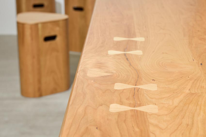 Schofeld không che giấu đặc tính tự nhiên của gỗ như mắt gỗ hay sự thay đổi sắc độ, mà chọn cách tôn vinh chúng bằng kỹ thuật nối bướm bo tròn góc vừa gia tăng tính thẩm mỹ, vừa tối ưu hóa quy trình sản xuất bằng máy móc. Thiết kế hướng đến sự tối giản, bền vững và kết nối sinh học với thiên nhiên, nâng cao cảm giác an yên trong không gian làm việc.