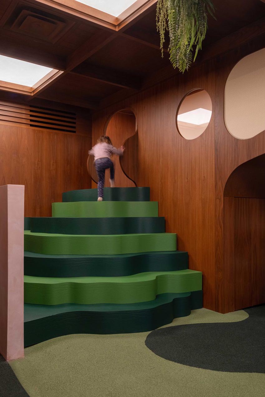 Không gian được bao phủ bởi các mảng ốp gỗ walnut. Thay vì bảng màu công nghiệp rực rỡ kiểu khu vui chơi trong nhà, nhóm thiết kế chọn nền trầm ấm, trưởng thành. Trên nền ấy, những yếu tố vui nhộn – bậc mút xanh hai tông, cầu trượt đỏ uốn cong, bảng ghim phát sáng – nổi lên như những chương truyện nhỏ. Không có gì quá lòe loẹt. Mọi thứ được tiết chế.