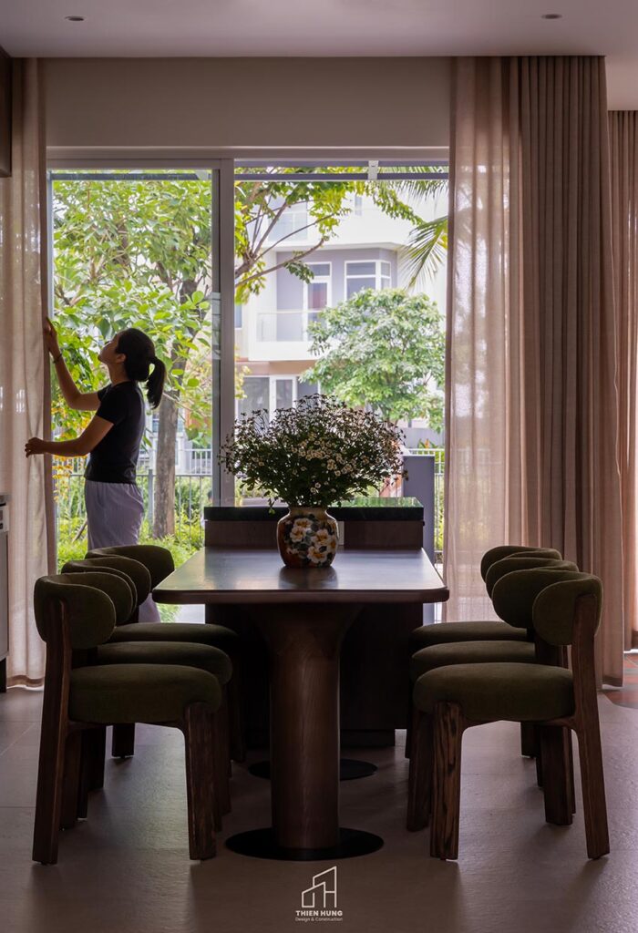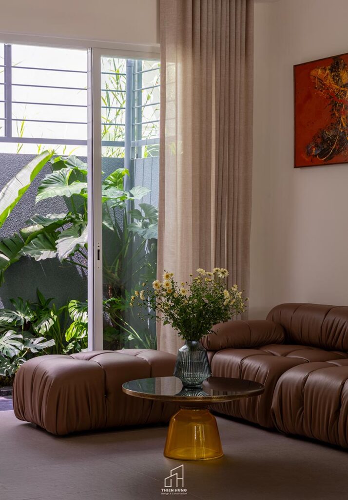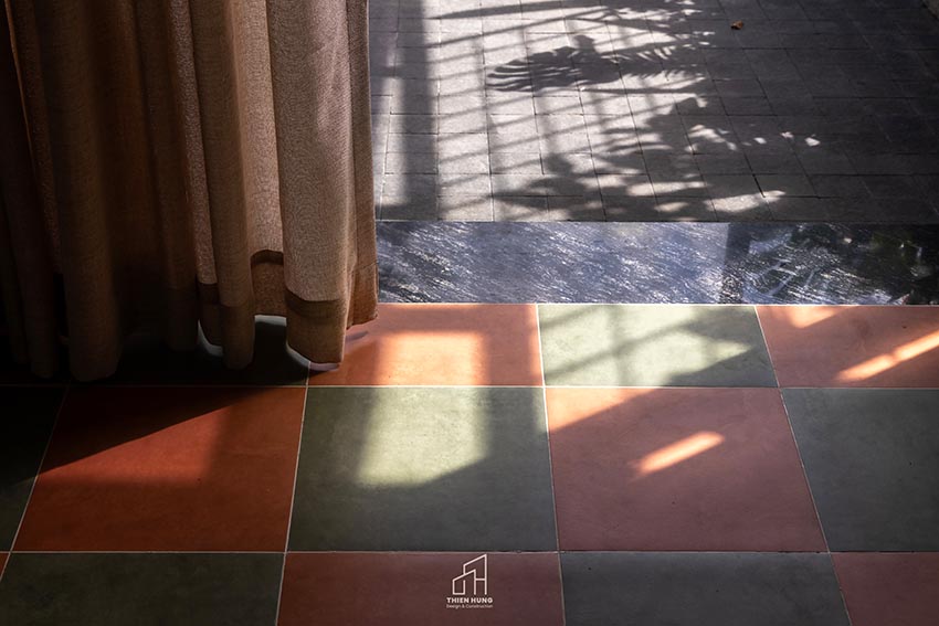 Khi kết hợp với cây xanh và ánh sáng tự nhiên, các mảng vật liệu thô mộc ấy trở nên sống động, giúp căn nhà “thở” một cách tự nhiên và đầy năng lượng.