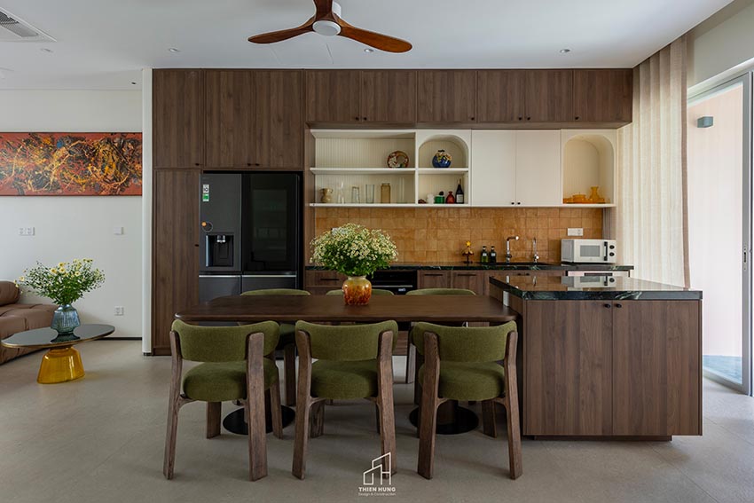 Ngôi nhà gồm ba tầng, được bố trí hợp lý cho một gia đình nhỏ với hai vợ chồng và con nhỏ một tuổi. Ở tầng trệt, thay vì tuân thủ bố cục ban đầu với khu bếp đặt phía sau, gia chủ và KTS đã quyết định hoán đổi bằng cách đưa bếp và bàn ăn ra phía trước, còn phòng khách được lùi vào trong, kết nối trực tiếp với khoảng sân sau. Cách sắp xếp này không chỉ giúp khu vực nấu nướng đón sáng tự nhiên mà còn tạo nên sự riêng tư nhẹ nhàng cho không gian sinh hoạt chung.