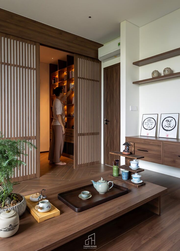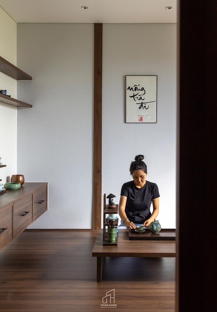 Lên tầng một là hai phòng ngủ: một dành cho vợ chồng, một cho con nhỏ, cùng hai khu vệ sinh được thiết kế gọn gàng và tiện dụng. Tầng ba mở ra khoảng không yên tĩnh với phòng ngủ phụ phía sau, và một không gian trà đạo kết hợp làm việc, nơi gia chủ có thể ngồi thiền, đọc sách hay thưởng trà. Góc thờ nhỏ ở phía trước tầng ba cũng được bố trí hài hòa, vừa trang nghiêm vừa gần gũi.
