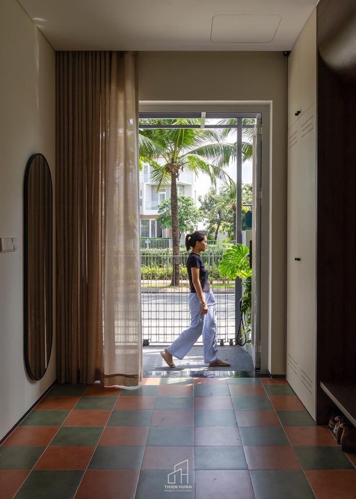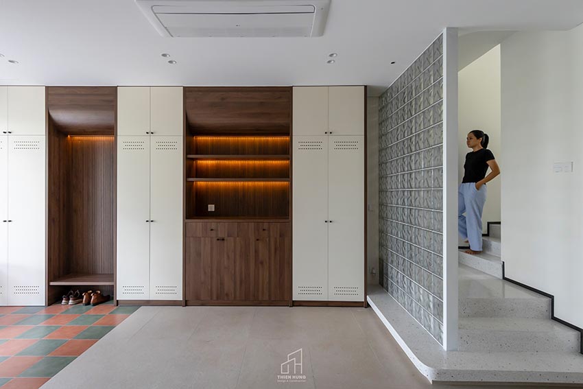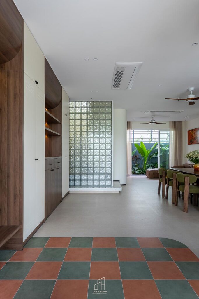 Vật liệu chủ đạo của công trình là gạch, gỗ và đá mài – những chất liệu tưởng chừng quen thuộc nhưng được phối hợp tinh tế để tạo nên tổng thể tĩnh mà không tẻ nhạt, vẽ nên bối cảnh sống của một gia đình hiện đại.
